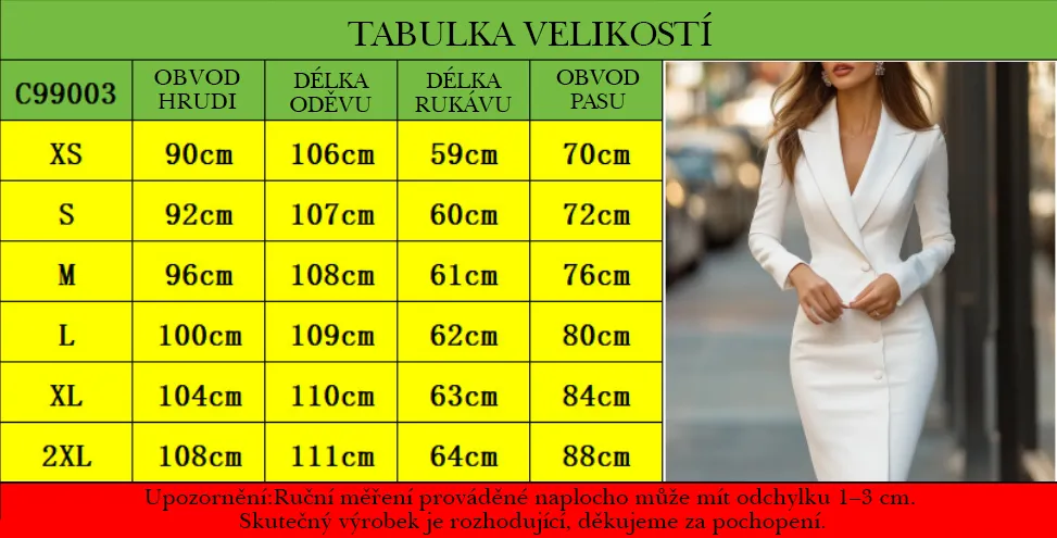 - Střih je navržen tak, aby zdůrazňoval přirozené křivky postavy, aniž by omezoval pohyb. Specifický střih a asymetrické knoflíky dodávají luxusní vzhled.